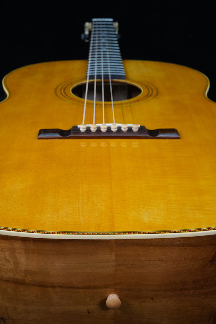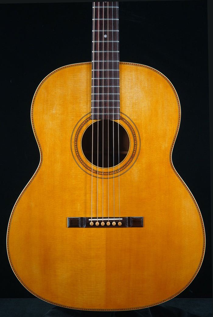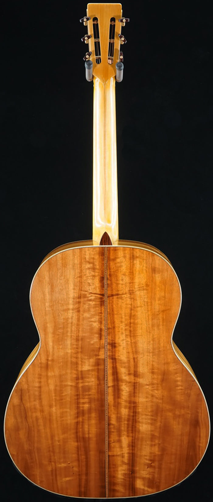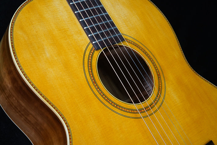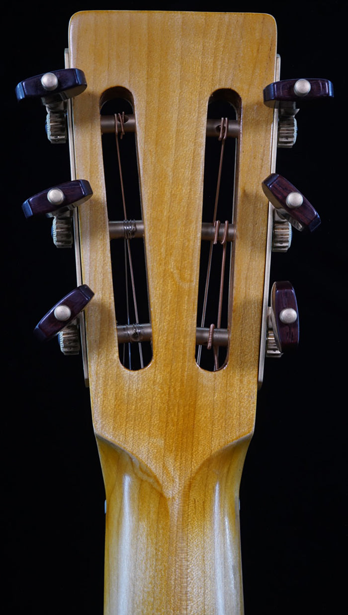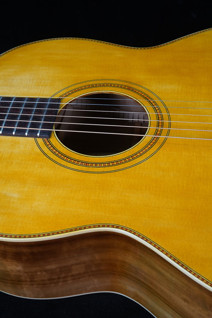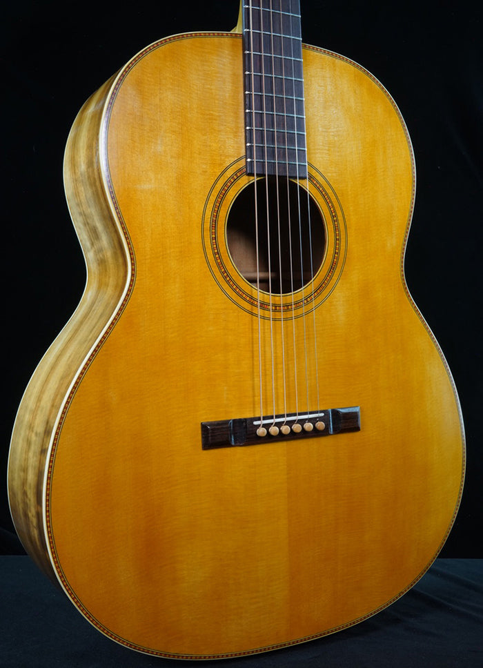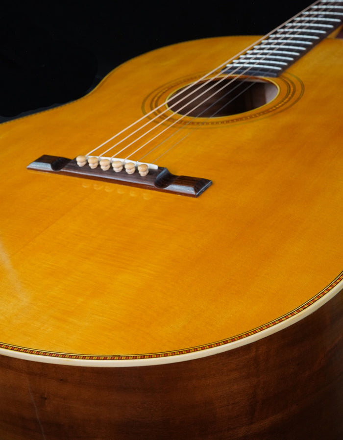 Notes: Since its inception Stay Gold Guitars has had the opportunity to have many special vintage flattop guitars available to study, learn from and take inspiration from. We are fortunate to have owned two of four Lyon & Healy made Lakeside jumbos known to exist. It is believed that Lakeside jumbos were made between approximately 1912 and the early 1920s as that is when they appear in catalogs. The models a fascinating history and some consider Lakeside jumbos the first true dreadnaught guitar produced. Lakeside jumbos predate both Martin made Ditson dreadnoughts and the later made Martin D-1/D-2. Our Lakeside jumbo model is inspired by the two Lakeside jumbos built in Chicago circa 1917 in our collection. We made plans to the specifications of the originals. Sitka spruce top and with beautifully figured poplar back/sides (poplar back/sides on originals were convincingly stained to look like rosewood). Neck joins the body at the 12th fret. One piece poplar neck hand carved with vintage "V" profile mirroring the original. Slotted headstock. Finished with a hand rubbed French polish finish. Ladder braced. Rosewood fretboard with MOP position markers. Rosewood bridge. Rubner vintage style open gear tuners. Beautiful handmade multicolored wood purlings/backstip. Rosewood heelcap and faceplate. Compensated bone saddle. Bone nut. Two way adjustable truss rod with sound hole access.