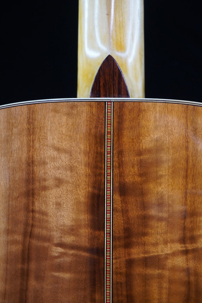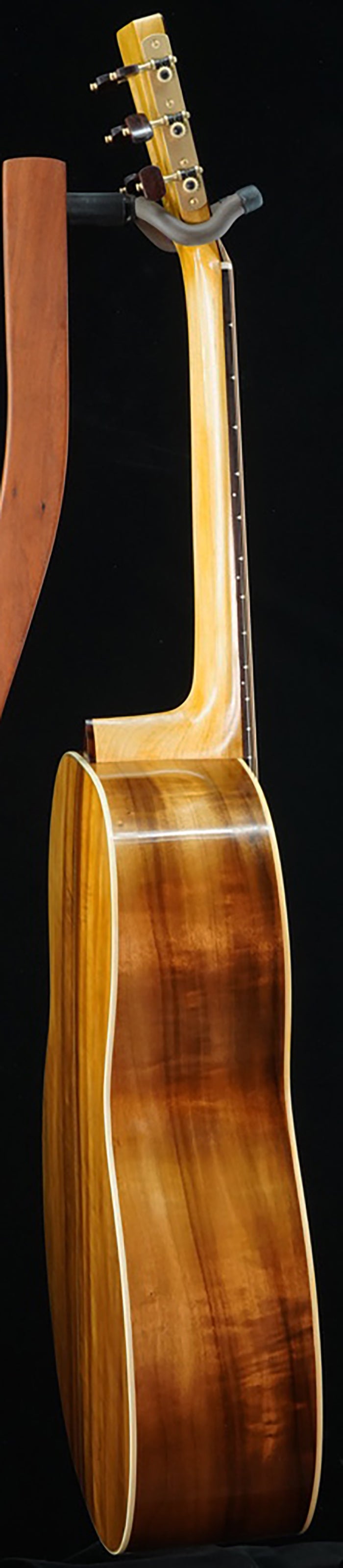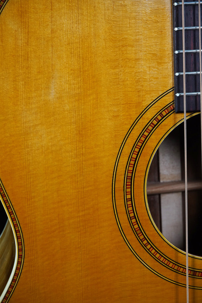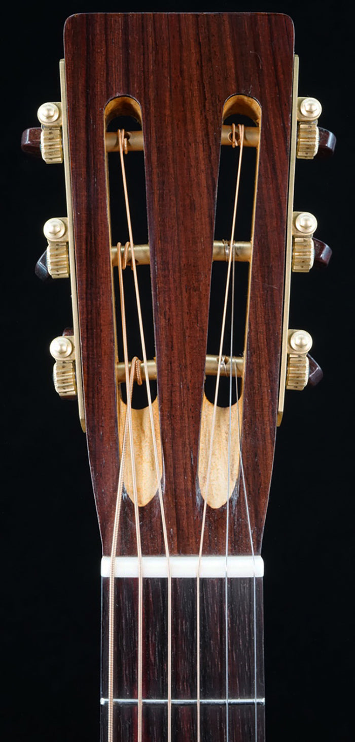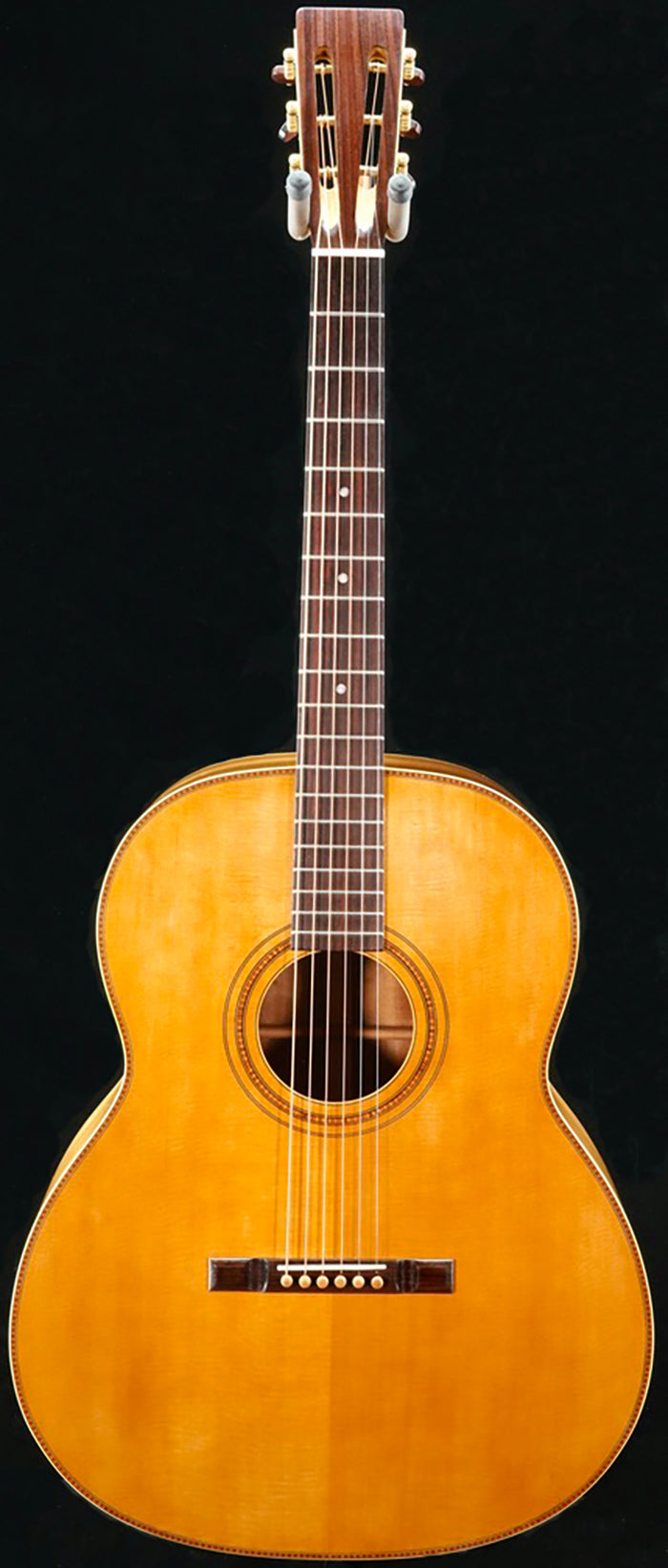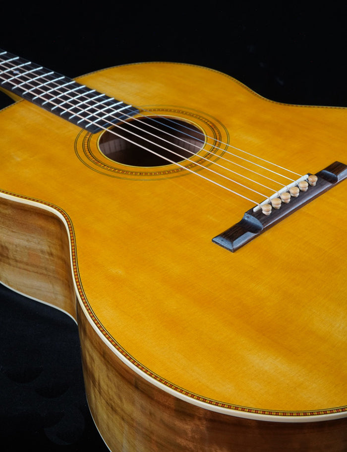 Notes: Since its inception Stay Gold Guitars has had the opportunity to have many special vintage flattop guitars available to study, learn from and take inspiration from. We are fortunate to have owned two of four Lyon & Healy made Lakeside jumbos known to exist. It is believed that Lakeside jumbos were made between approximately 1912 and the early 1920s as that is when they appear in catalogs. The models a fascinating history and some consider Lakeside jumbos the first true dreadnaught guitar produced. Lakeside jumbos predate both Martin made Ditson dreadnoughts and the later made Martin D-1/D-2. Our Lakeside jumbo model is inspired by the two Lakeside jumbos built in Chicago circa 1917 in our collection. We made plans to the specifications of the originals. Sitka spruce top and with beautifully figured poplar back/sides (poplar back/sides on originals were convincingly stained to look like rosewood). Neck joins the body at the 12th fret. One piece poplar neck hand carved with vintage "V" profile mirroring the original. Slotted headstock. Finished with a hand rubbed French polish finish. Ladder braced. Rosewood fretboard with MOP position markers. Rosewood bridge. Rubner vintage style open gear tuners. Beautiful handmade multicolored wood purlings/backstip. Rosewood heelcap and faceplate. Compensated bone saddle. Bone nut. Two way adjustable truss rod with sound hole access.