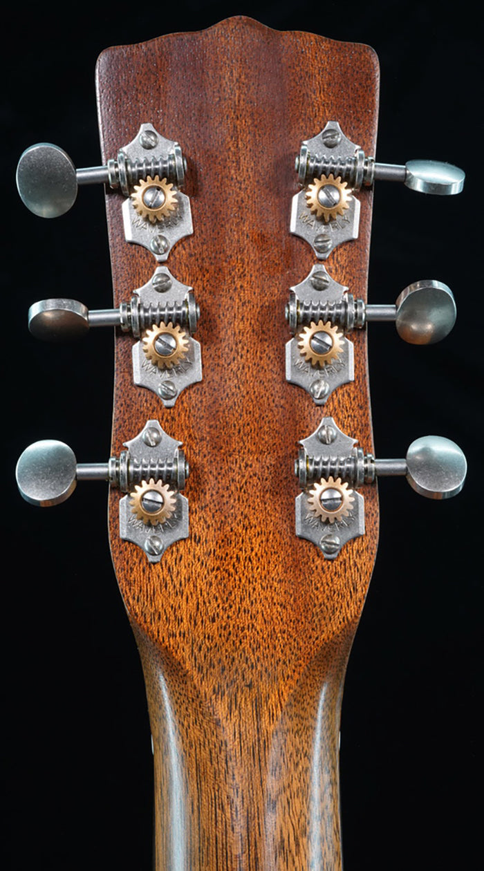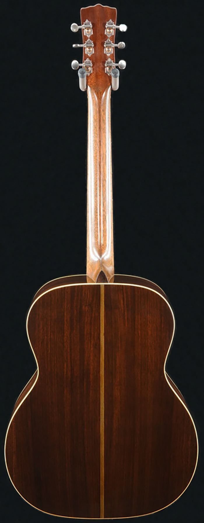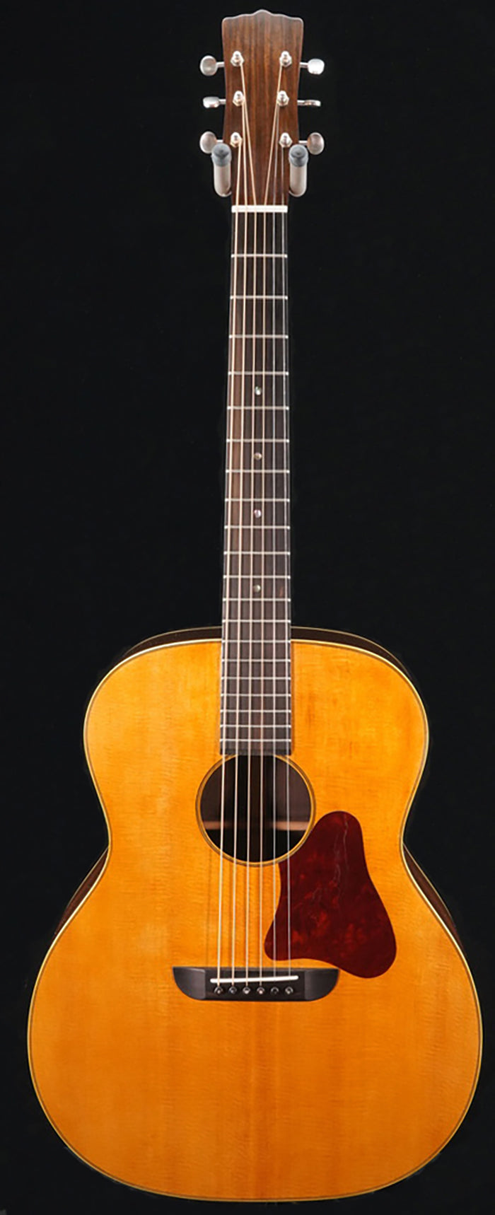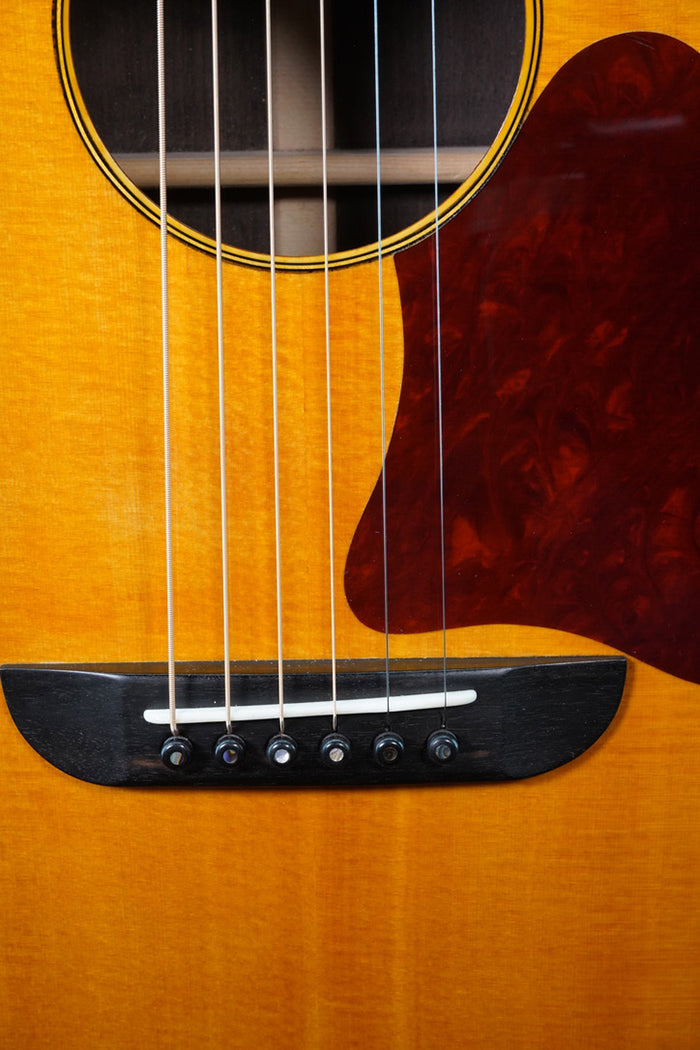 Notes: Since its inception Stay Gold Guitars has had the opportunity to have many special vintage flattop guitars available to study, learn from and take inspiration from. The 1930s Washburn 5257 is one of those models. We've owned several and each has been wonderful in its own regard. We love the unique dimensions of the 5257 and have found them wonderfully balanced and equally adept at both fingerstyle and flatpicking playing - something that is not easy to find in a guitar. So, when we decided to utilize our experience with vintage flattops in building vintage inspired new guitars a reproduction of the Washburn 5257 immediately came to mind. Our 5257 model is inspired by the Regal made/Washburn branded 5257s built in Chicago during the 1930s. We made plans to the specifications of an original c. 1936 5257 in our collection. We're extremely proud of the results! Sitka spruce top and Indian Rosewood back/sides. One piece mahogany neck hand carved with vintage "V" profile mirroring the original. Finished with a hand rubbed French polish finish. Non-scaloped spruce bracing shaped to the original specs. Ebony fretboard with MOP position markers. Ebony "smile" bridge. Ebony bridge pins with MOP dots. Waverly brushed nickel vintage style open gear tuners. Tortoise pick guard with the distinctive 1930s Regal shape. Cream colored celluloid body bindings. Compensated bone saddle. Bone nut. Rosewood heelcap and faceplate. Two way adjustable truss rod with sound hole access. 25 1/4" lower bout, 11 1/2" upper bout and 4 1/4" deep at end pin