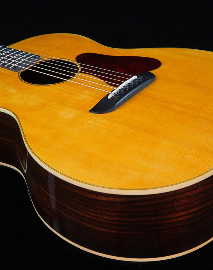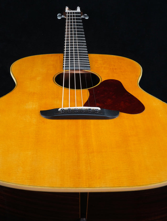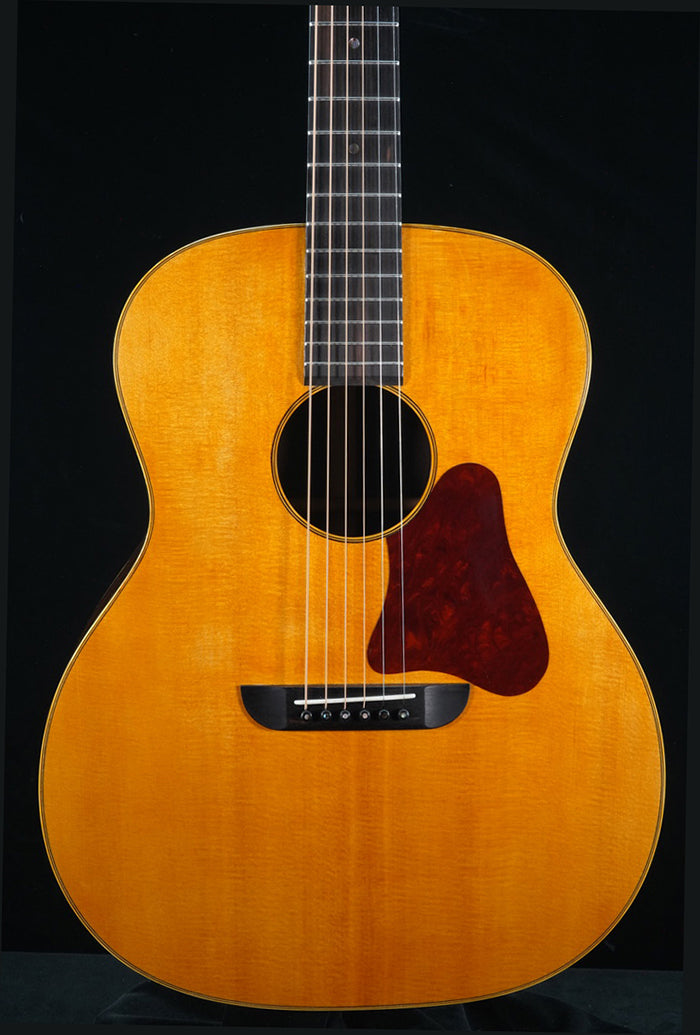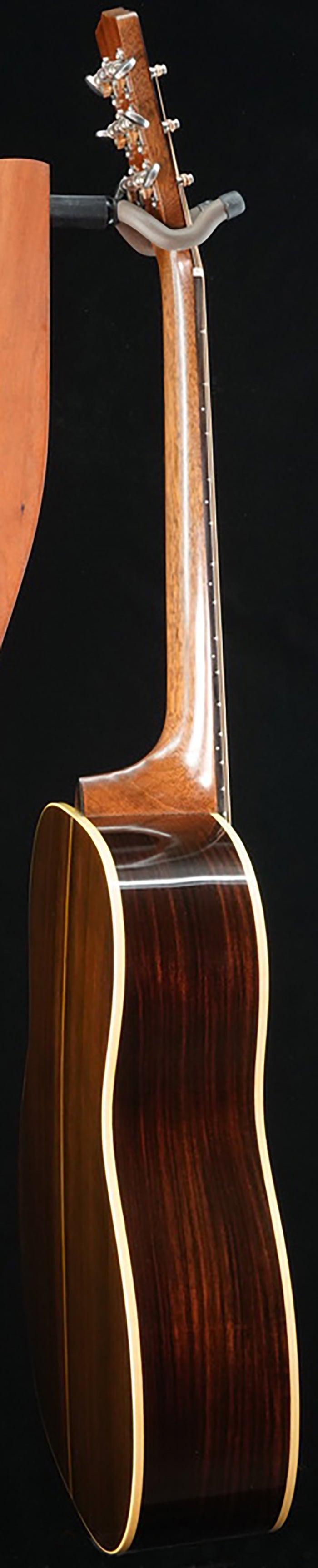 Notes: Since its inception Stay Gold Guitars has had the opportunity to have many special vintage flattop guitars available to study, learn from and take inspiration from. The 1930s Washburn 5257 is one of those models. We've owned several and each has been wonderful in its own regard. We love the unique dimensions of the 5257 and have found them wonderfully balanced and equally adept at both fingerstyle and flatpicking playing - something that is not easy to find in a guitar. So, when we decided to utilize our experience with vintage flattops in building vintage inspired new guitars a reproduction of the Washburn 5257 immediately came to mind. Our 5257 model is inspired by the Regal made/Washburn branded 5257s built in Chicago during the 1930s. We made plans to the specifications of an original c. 1936 5257 in our collection. We're extremely proud of the results! Sitka spruce top and Indian Rosewood back/sides. One piece mahogany neck hand carved with vintage "V" profile mirroring the original. Finished with a hand rubbed French polish finish. Non-scaloped spruce bracing shaped to the original specs. Ebony fretboard with MOP position markers. Ebony "smile" bridge. Ebony bridge pins with MOP dots. Waverly brushed nickel vintage style open gear tuners. Tortoise pick guard with the distinctive 1930s Regal shape. Cream colored celluloid body bindings. Compensated bone saddle. Bone nut. Rosewood heelcap and faceplate. Two way adjustable truss rod with sound hole access. 25 1/4" lower bout, 11 1/2" upper bout and 4 1/4" deep at end pin