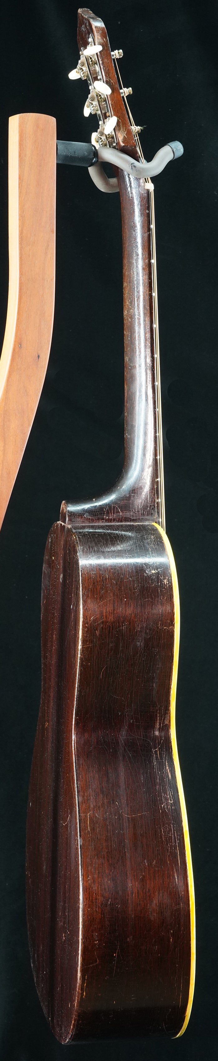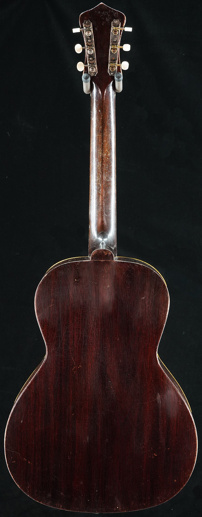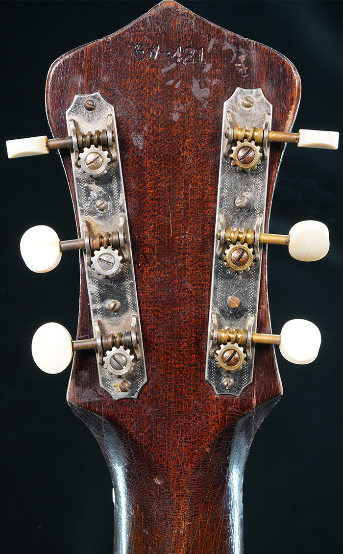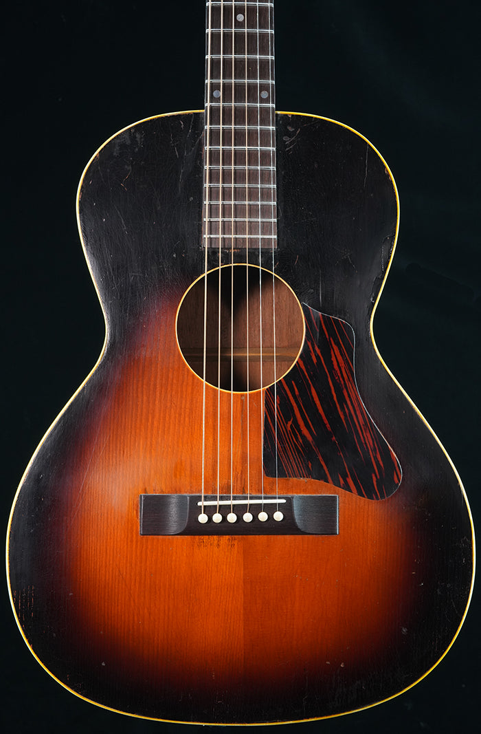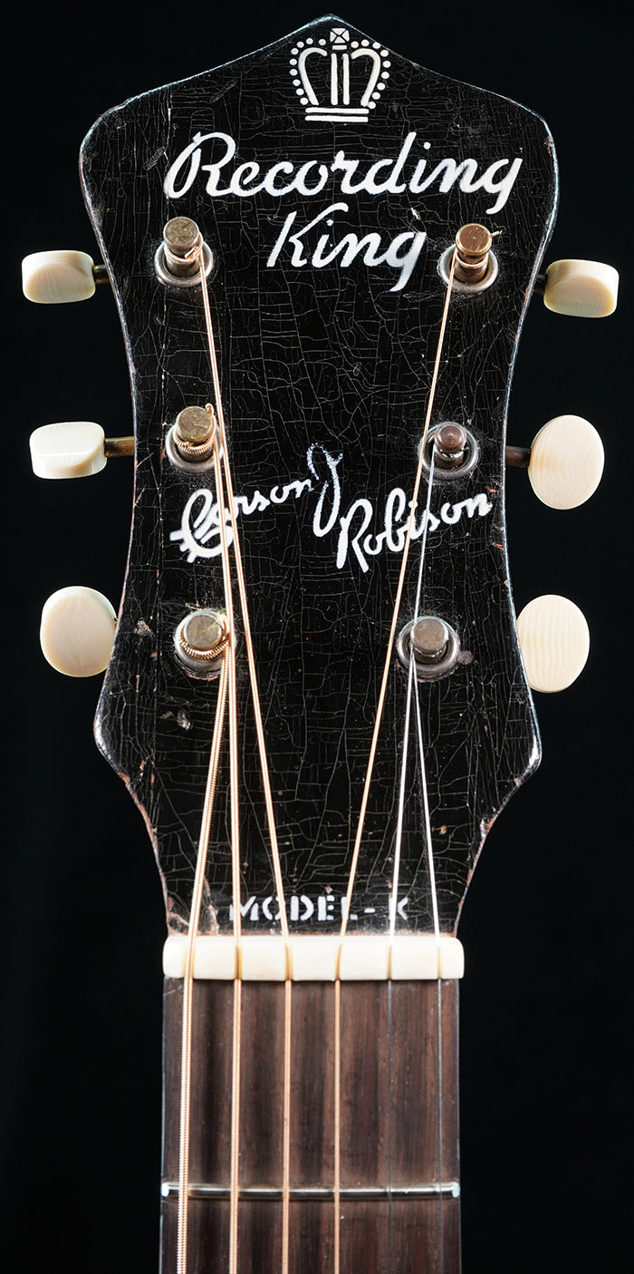 c. late 1930s Gibson made Recording King Model-K Carson J. Robison. Essentially the same as a Kalamazoo KHG-14. Ladder braced. Mahogany neck with a vintage "V" profile. Repair/restoration included: neck reset and carbon rod added to the neck for stability, new frets, replacement rosewood bridge, new bone saddle, new bone nut, new maple bridgeplate, internal braces were restored and reglued. Tuners are replacements. Replacement tiger stripe pick guard. Finish has various scratches/scuffs/dings, etc... and this is a players guitar. One repaired top crack on upper bout near fretboard extension. No back/side cracks. Comes with used non-original HSC.