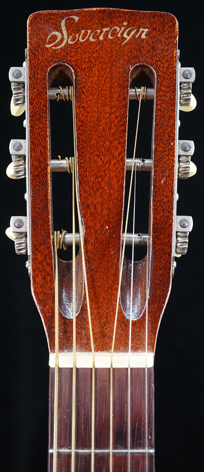 This is a rare example of a circa 1939-1940 Harmony made Sovereign "figure 8" slotted headstock model in original and very playable condition. It is getting harder to find these guitars in original condition and in overall condition such as this one. This is such an interesting guitar as we see the influence of original Oscar Schmidt made Sovereign guitars in the appointments, headstock script, body shape, etc.... The only repair apparent is that the guitar has had a neck reset (fretboard extension shim) at some point in the past. Remarkably, the guitar if crack free. The guitar is in excellent overall condition save some play wear on the top of the guitar. Beautiful multicolored purfling/rosette and backstrip. Brazilian Rosewood fretboard. Original "strings through" bridge. Original tuners function well. Original frets are in very good condition. Mahogany neck has vintage "V" profile. Overall, an excellent example. Comes with non-original hardshell case.