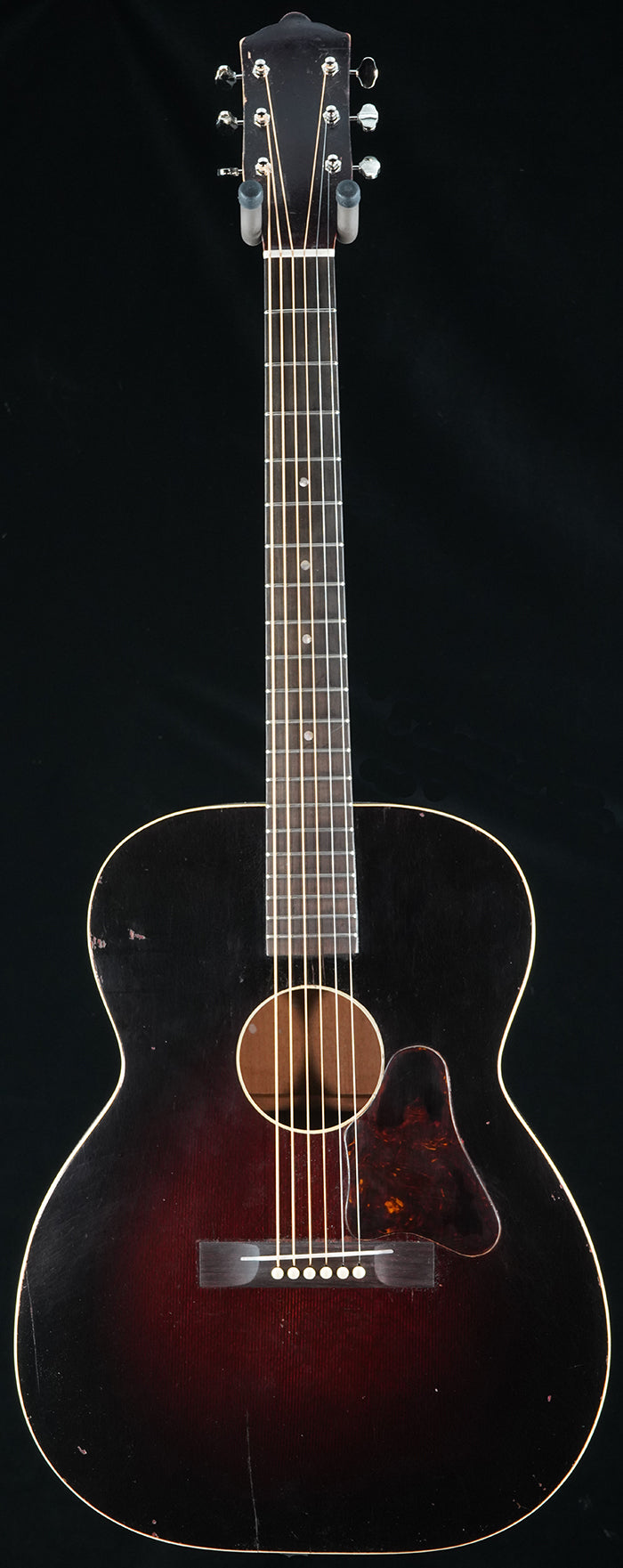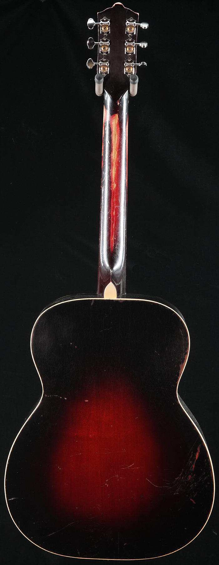 This is an interesting piece we have restored and we've not come across one like it. Made by Regal in Chicago c. late 1930s. Like some Regals of the era the headstock was carved with an Oahu shape similar to Kay made Oahus of the day. The auditorium sized body has a shape similar to Regal made 5257s with the same distinctive Regal shaped pick guard. Top was finished in a beautiful deep red sunburst. Ladder braced with a sweet and woody tone that has just enough upper harmonics chime and good sustain. Mahogany body. Neck appears to be poplar and has a distinct "V" profile. Restoration work we performed: neck reset, original fingerboard replaned, new frets, we recreated the original damaged spruce back braces and installed according to the original positioning/specs, loose top braces reglued, new bridgeplate as original was damaged and not in the correct position, new rosewood bridge, new bone nut and new compensated bone saddle, one approx. 3.0" top crack repair, new Grover open gear 18:1 tuners. Comes with non-original HSC.