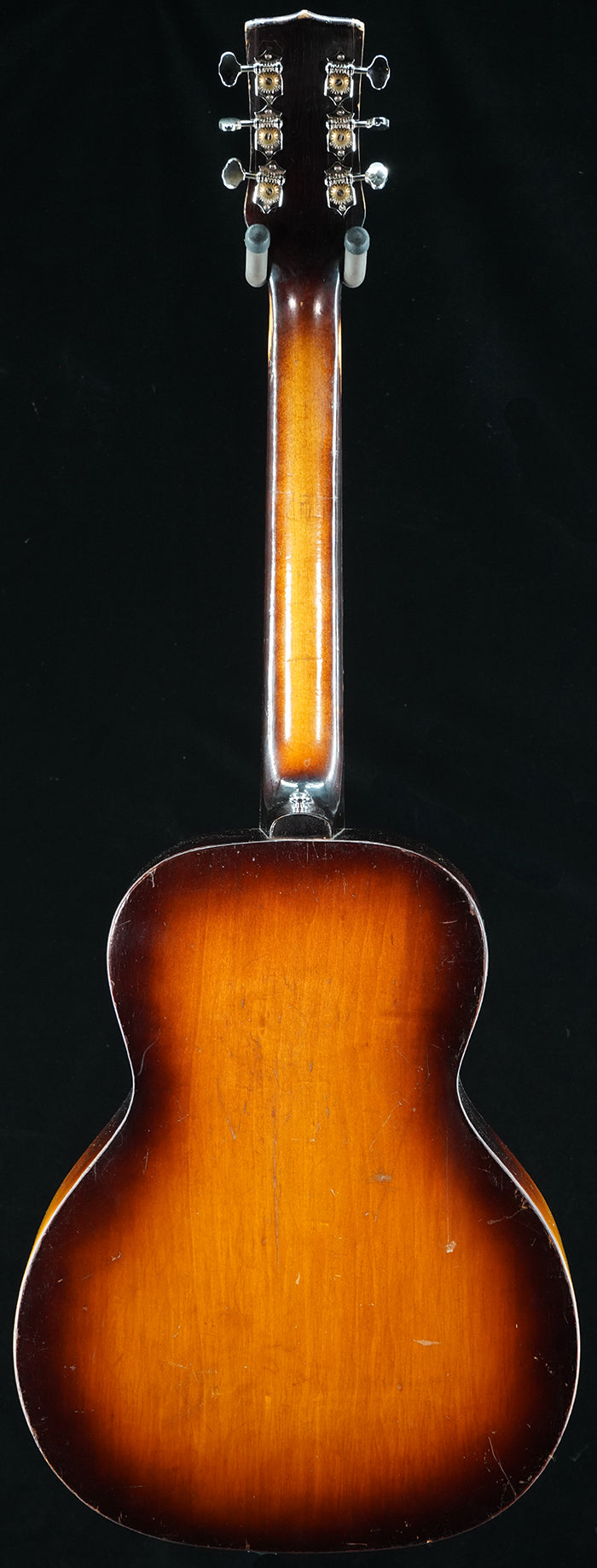 This c. late 1930s-early 1940s Regal has been transformed through a complete rebuild and X brace conversion using Stay Gold Guitars' method of X bracing. Now it sounds and plays phenomenally! This guitar is an interesting model with a size closer to a "grand concert" than a "concert" size yet at 14 1/8" wide it is narrower than a Gibson L-00. Rebuild work included: removing the back of the guitar and replacing existing ladder bracing on top of the guitar with X bracing, replacing back bracing, replacing old bridge plate with a new maple bridge plate, replacing old bridge with a new rosewood pin bridge, neck reset, fingerboard replaned, old frets removed and replaced with a complete new fret job, crack repairs, old tuners replaced with Grover 18:1 open gear tuners, new bone nut/compensated bone saddle, new plastic bridge pins, expert setup job. Comes with new hardshell case.