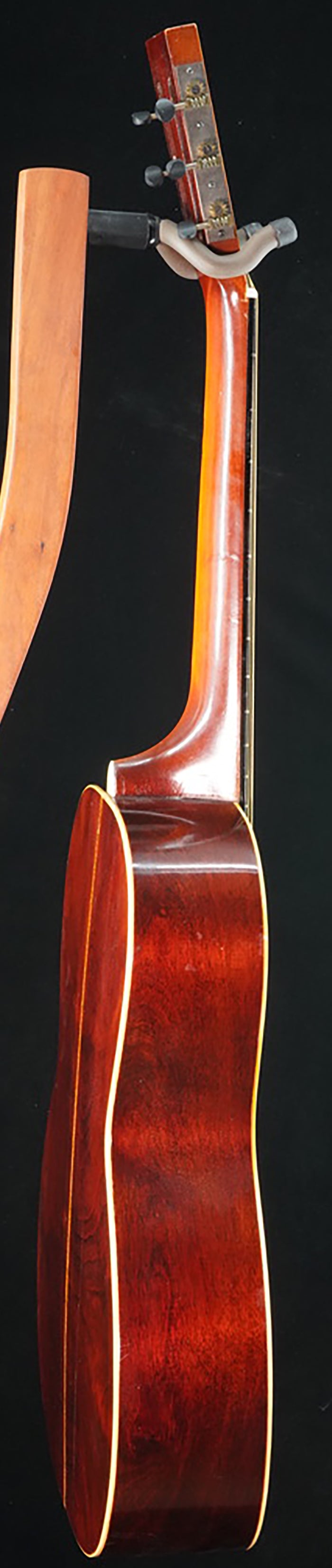 This circa late 1920s Regal concert sized guitar is in excellent mostly original condition. We don't come across many with this combination of beautiful colorful marquetry and "fancy decalcomania" back strip. We adjusted the action and it plays comfortably with a very pleasant sound. Solid spruce top and solid birch back/sides. Neck appears to be made of poplar and has a vintage "V" profile typical of this era of guitars. Fingerboard is original appears to be died maple. Bridge appears to be original with a drop in saddle. Original tuners function well. Original frets. Replacement bridge pins. We made a new bone nut and repaired two back cracks. Chipboard case.