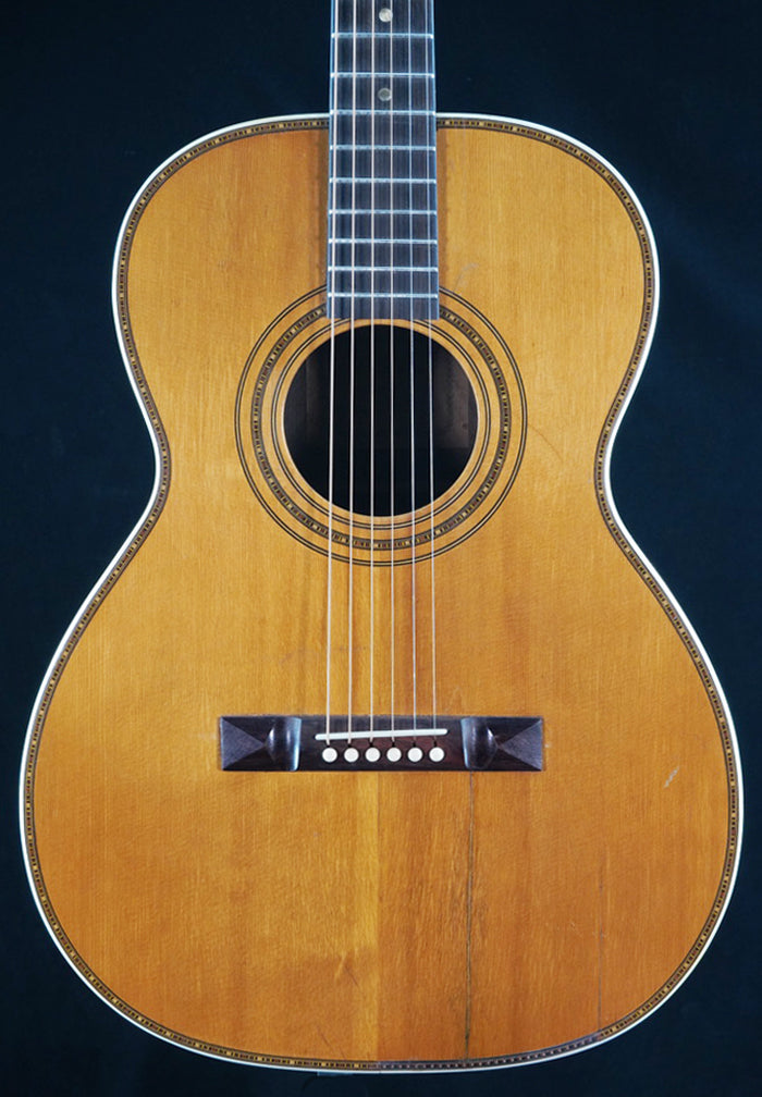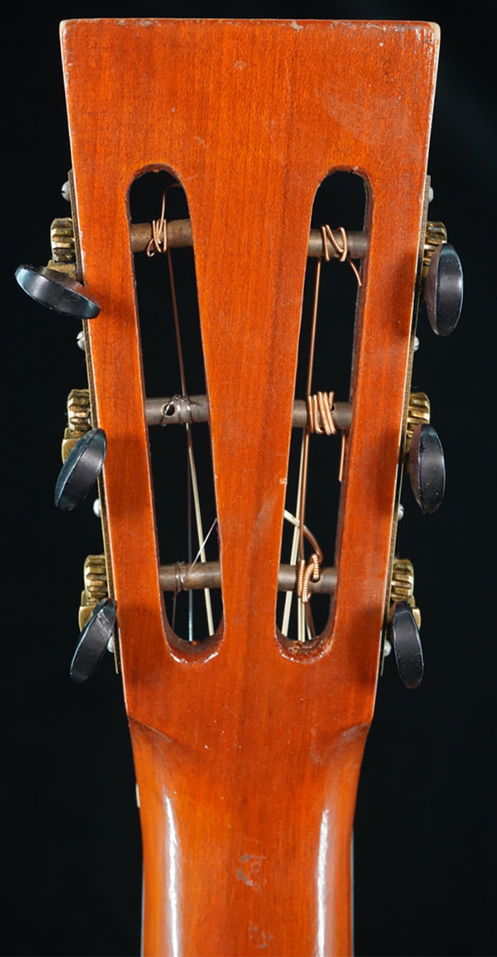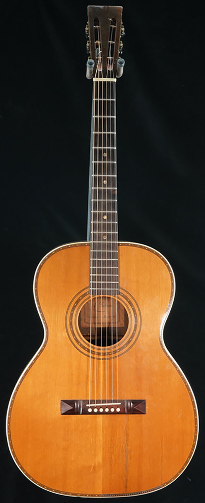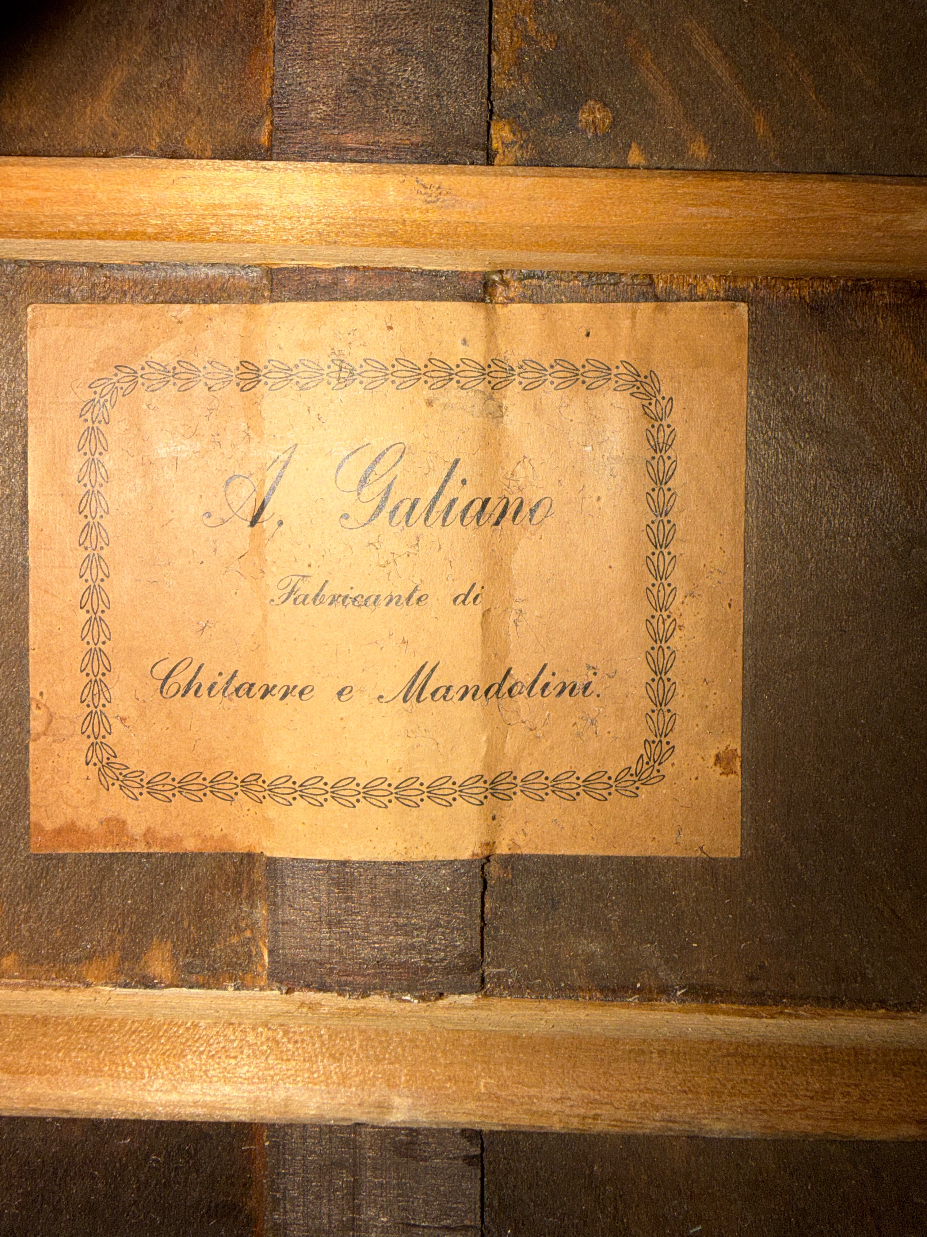 Rare circa 1920s A. Galiano branded auditorium sized guitar. While there are many examples of Galiano branded concert and grand concert sized guitars auditorium sized models are very rare. This guitar bears many hallmarks of the Italian American luthiers building instruments around New York City in the early part of the 20th Century such as Cerrito, Nettuno, Grouse, Ciani, etc... Spruce top with poplar back/sides. Ladder braced. Poplar neck with a comfortable but deep "C" shaped neck profile. Beautiful old world style multicolored purfling and rosette. Wooden backstrip appears to be maple and ebony. White celluloid binding. Original rosewood pyramid bridge. Original open geared tuners function well. Repair work completed: top and back crack repairs, neck reset, carbon rod added to the neck, new frets, new radiused ebony fretboard, new bone nut/bone saddle, new maple insert added to spruce bridge plate under string ball end area, braces regaled, one approximately 6.0" long piece of top purfling repaired by splicing in similar colored /designed purfling, replacement plastic bridge pins. Includes non-original hardshell case.