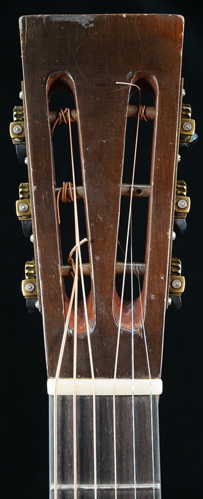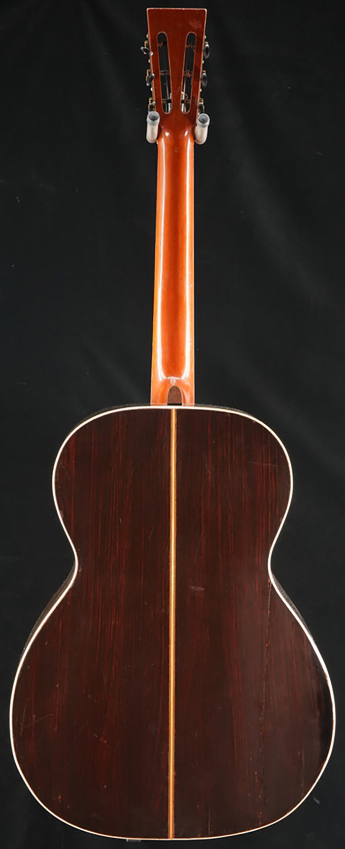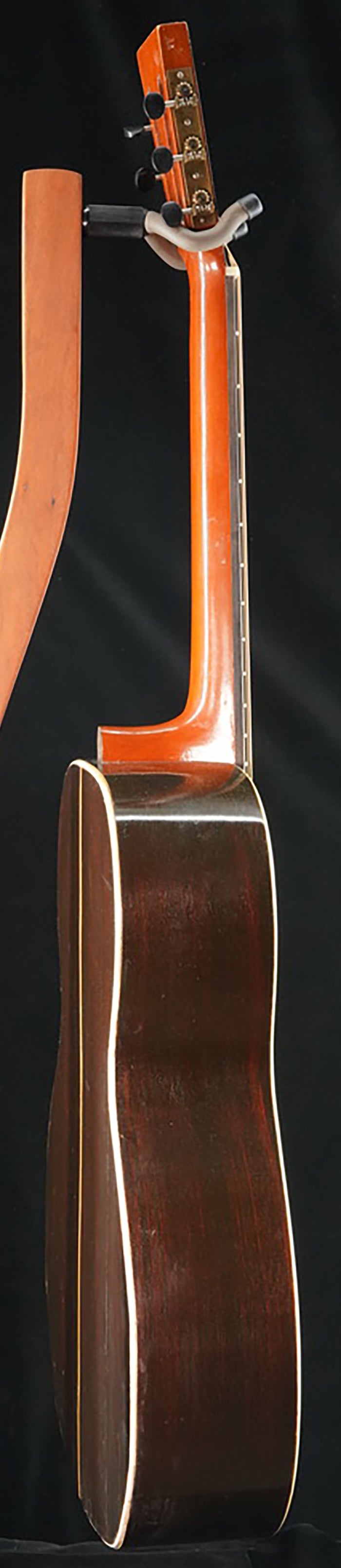 Rare circa 1920s A. Galiano branded auditorium sized guitar. While there are many examples of Galiano branded concert and grand concert sized guitars auditorium sized models are very rare. This guitar bears many hallmarks of the Italian American luthiers building instruments around New York City in the early part of the 20th Century such as Cerrito, Nettuno, Grouse, Ciani, etc... Spruce top with poplar back/sides. Ladder braced. Poplar neck with a comfortable but deep "C" shaped neck profile. Beautiful old world style multicolored purfling and rosette. Wooden backstrip appears to be maple and ebony. White celluloid binding. Original rosewood pyramid bridge. Original open geared tuners function well. Repair work completed: top and back crack repairs, neck reset, carbon rod added to the neck, new frets, new radiused ebony fretboard, new bone nut/bone saddle, new maple insert added to spruce bridge plate under string ball end area, braces regaled, one approximately 6.0" long piece of top purfling repaired by splicing in similar colored /designed purfling, replacement plastic bridge pins. Includes non-original hardshell case.